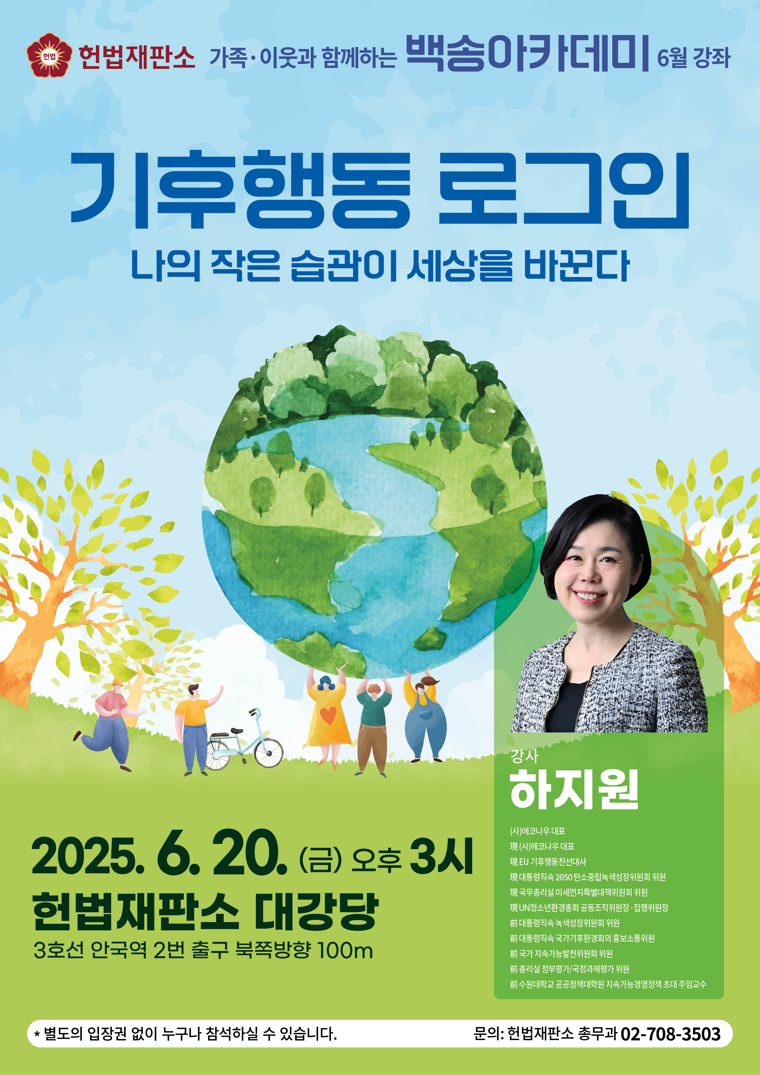 1. 헌법재판소는 사회 각계 저명인사를 초빙, 그들의 다양한 경험을 함께 나누기 위해 <백송아카데미> 공개 강연을 운영하고 있습니다. 2. 본 강연은 헌법재판소 직원뿐만 아니라, 인근 주민 및 관심 있는 모든 분들께 개방되어 있으니, 희망하시는 분들의 많은 참여를 바랍니다. 3. 강의 안내 1) 일 시: 2025. 6. 20.(금) 15:00 2) 장 소: 헌법재판소 대강당 3) 강 사: 하지원 (사) 에코나우 대표 4) 주 제: 기후행동 로그인: 나의 작은 습관이 세상을 바꾼다