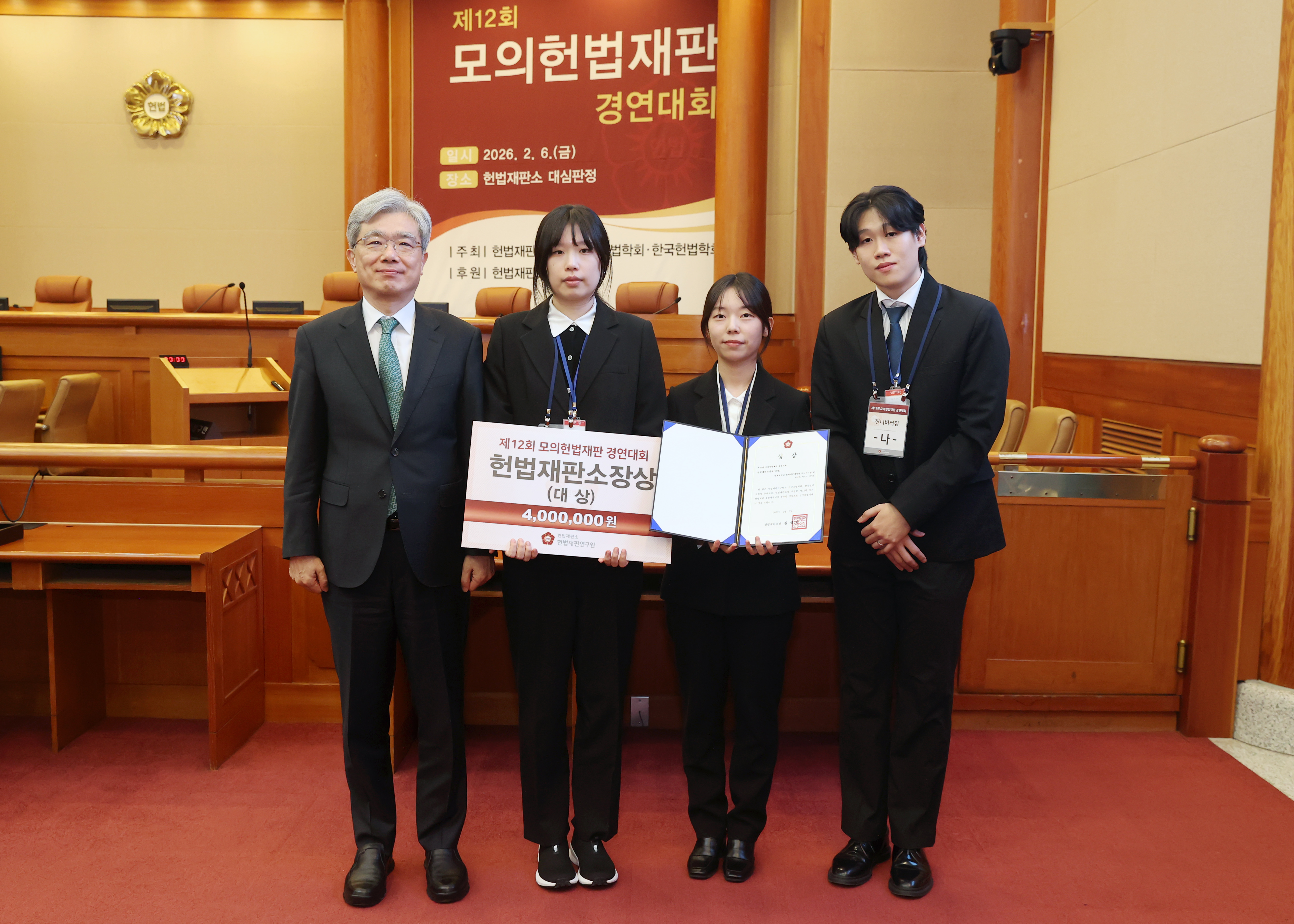 김상환 헌법재판소장(맨 왼쪽)은 2월 6일 헌법재판소 대심판정에서 열린 ‘제12회 모의헌법재판 경연대회’에서 헌법재판소장상(대상)을 수상한 연세대학교 ‘헌니버터칩’팀(왼쪽부터 김서연, 황지은, 빅민석씨)에게 상장과 상금을 시상했습니다.