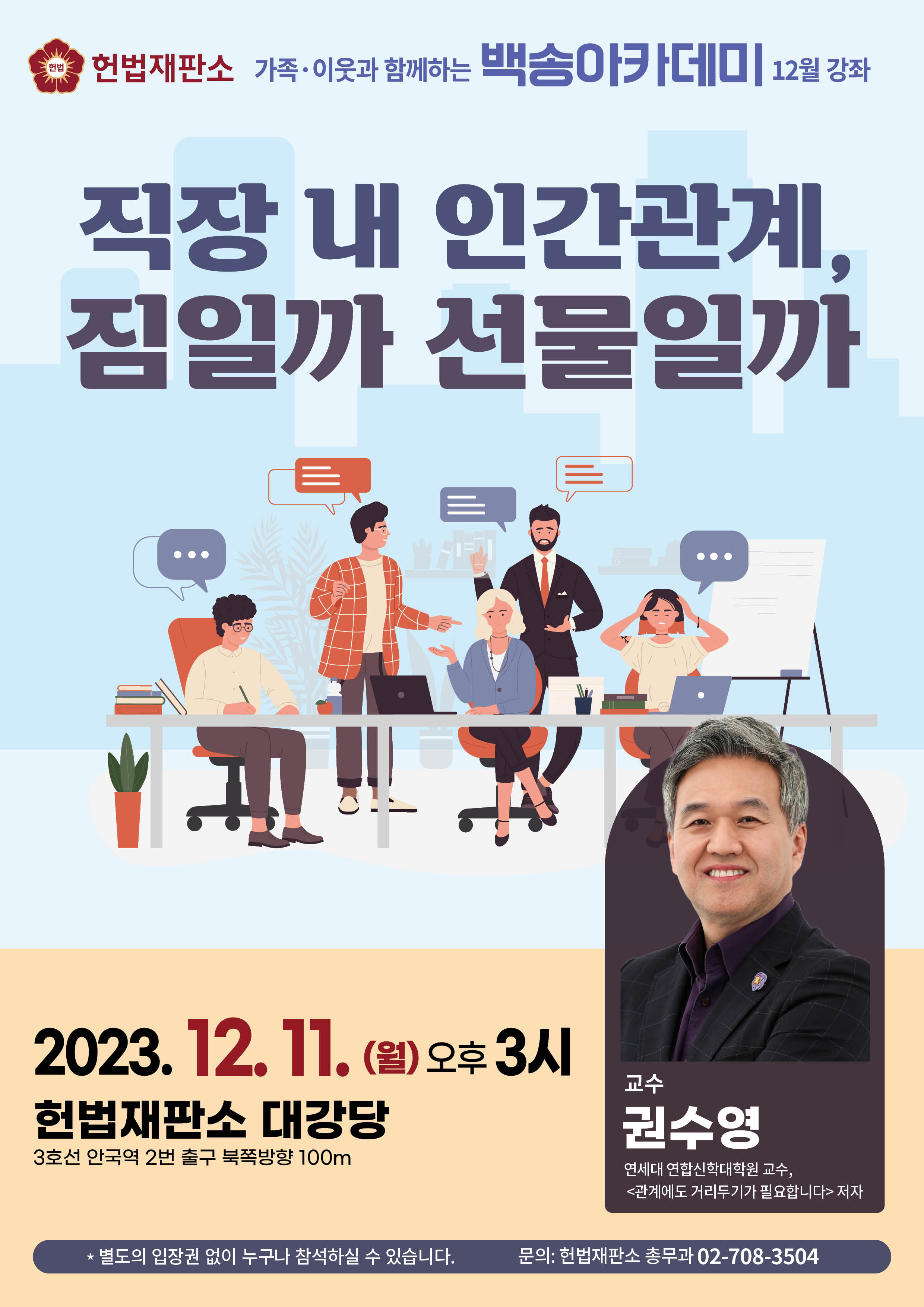 1. 헌법재판소는 사회 각계 저명인사를 초빙, 그들의 다양한 경험을 함께 나누기 위해 <백송아카데미> 공개 강연을 운영하고 있습니다. 2. 본 강연은 헌법재판소 직원뿐만 아니라, 인근 주민 및 관심 있는 모든 분들께 개방되어 있으니, 희망하시는 분들의 많은 참여를 바랍니다. 3. 강의 안내 1) 일 시: 2023. 12. 11.(월) 15:00 2) 장 소: 헌법재판소 대강당 3) 강 사: 권수영 교수 4) 주 제: <직장 내 인간관계, 짐일까 선물일까>
