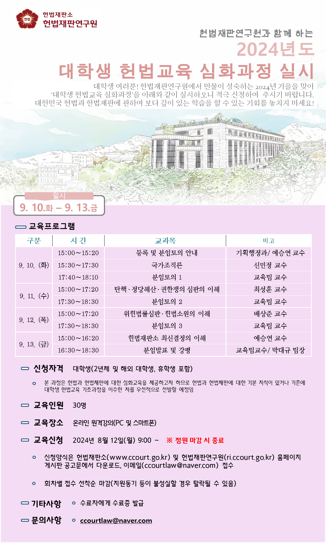 우리 연구원에서는 2024년 가을학기를 맞아 대학생 헌법교육 심화과정(제2기)에 참여하실 대학생들을 모집합니다.