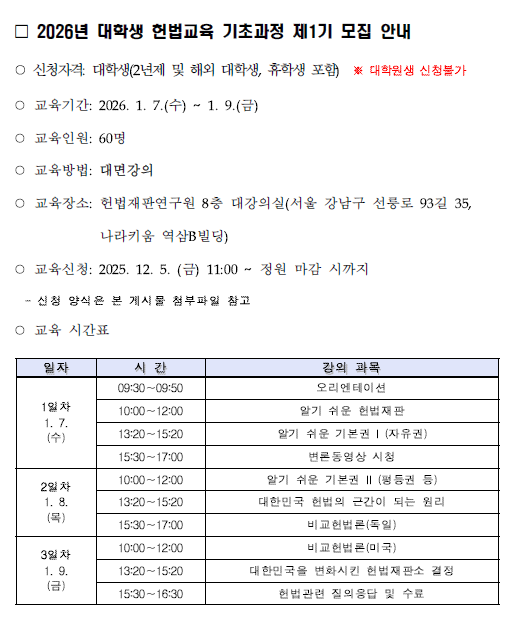 우리 연구원에서는 2026년 대학생 헌법교육 기초과정 제1기에 참여하실 대학생들을 모집합니다.