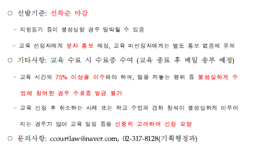 ★ 교육 신청 후 취소하는 사례 또는 학교 수업과 겹쳐 참석이 불성실하게 이루어지는 경우가 많으니 교육 일정 등을 충분히 고려하여 신청하여 주시기 바랍니다.